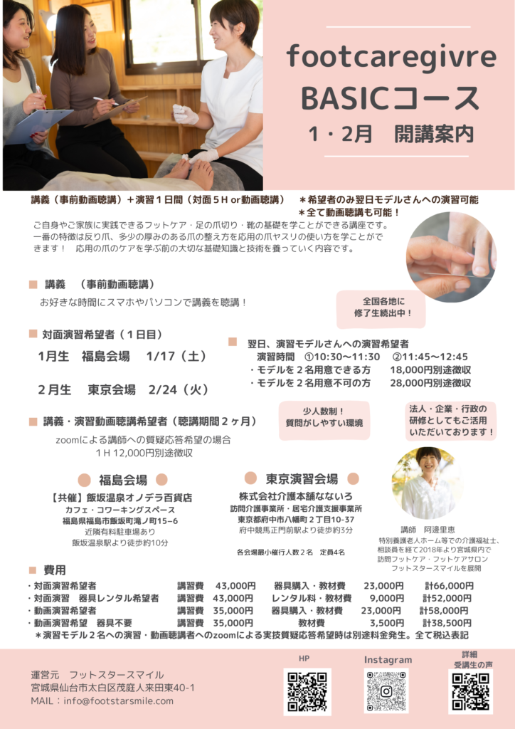 2026年1月よりフットケアギバー講座は法人の代表理事を務めております阿邊が代表者を務める「フットスタースマイル(フットケアサロン・訪問フットケア)」に運営を移行いたします。現在ホームページのリニューアル中にて講座の詳細は下記をご覧ください。