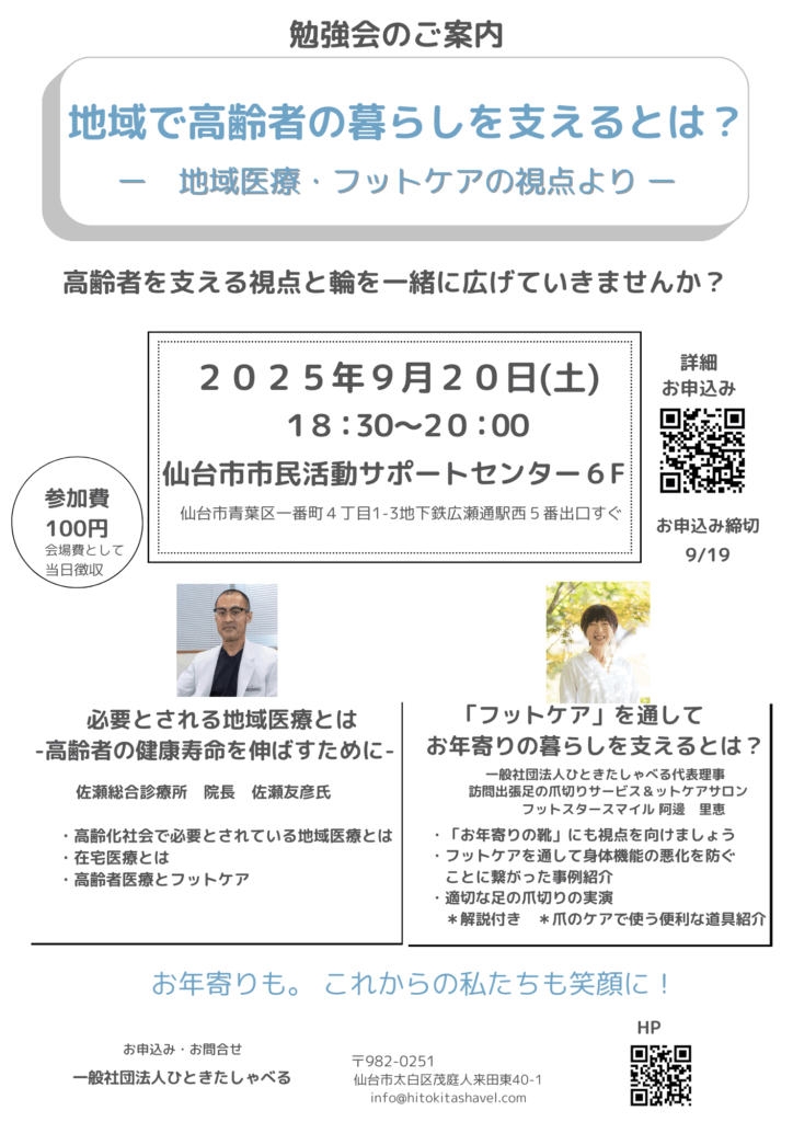 中学生の頃より家族介護を経験し介護福祉士、介護支援専門員等として特別養護老人ホームなどに長年勤務してきました。2019年より宮城県内の在宅や施設への訪問による足の爪切りなどのフットケアサービスを展開し片道2時間半の七ヶ宿町にも毎月訪問しています。2021年コミュニティフットケアサロンオープン。フットケア講座、研修の講師も務めており沖縄から北海道まで介護士、看護師さん等にご受講いただいております。当日、足の爪切りのワンポイントアドバイス、フットケアを通してのフレイル、身体機能の悪化を防ぐことにも繋がっているお年寄りの声、変化もご紹介いたします。